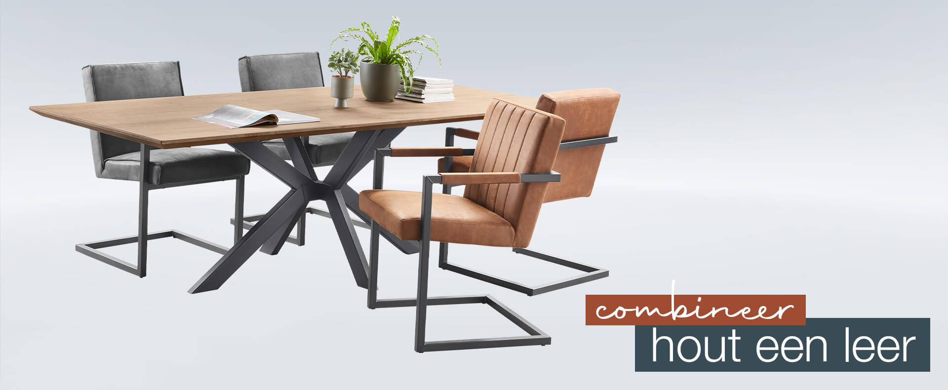 2 ) Stoere industriele eethoek? Combineer leer en hout!