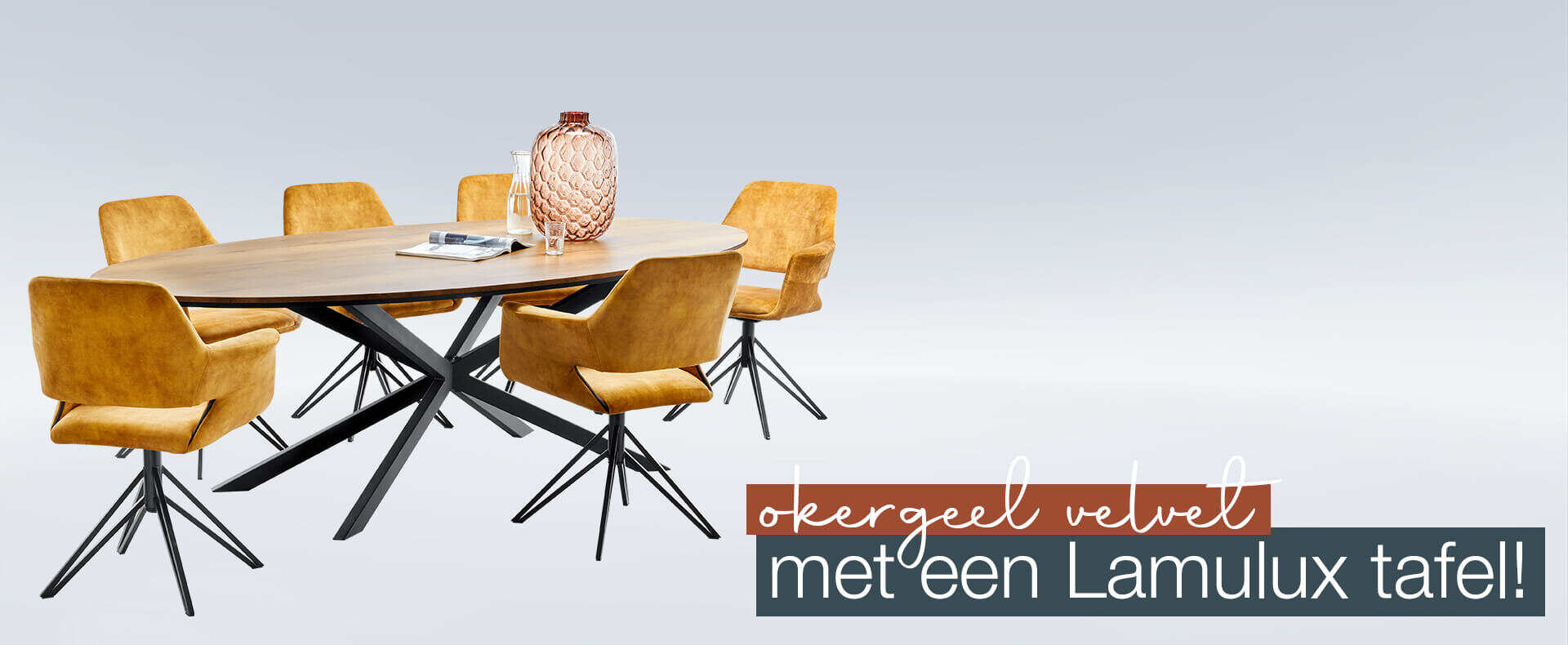 Deze combinatie is toch geweldig! De Comani ovale tafel met de Komera stoelen. De stoelen zijn in okergeel velvet, wat echt een voorjaarsgevoel geeft. Geel is de kleur van de zon, en die halen we graag in huis in het voorjaar. Én mega handig: De Komera stoelen hebben een terugdraaimechanisme, hierdoor staan de stoelen altijd netjes aangeschoven. Maar wat dacht je van deze tafel! Die mogen we zeker niet overslaan. Het blad is gemaakt van Lamulux, een super sterk materiaal wat precies lijkt op hout. De zwarte metalen poten zorgen voor een prachtig contrast met het blad. Fijn detail: De poten van de tafelen en stoelen matchen bij elkaar. En door de vorm van de tafel passen er genoeg stoelen aan. Dit is toch een top combinatie!